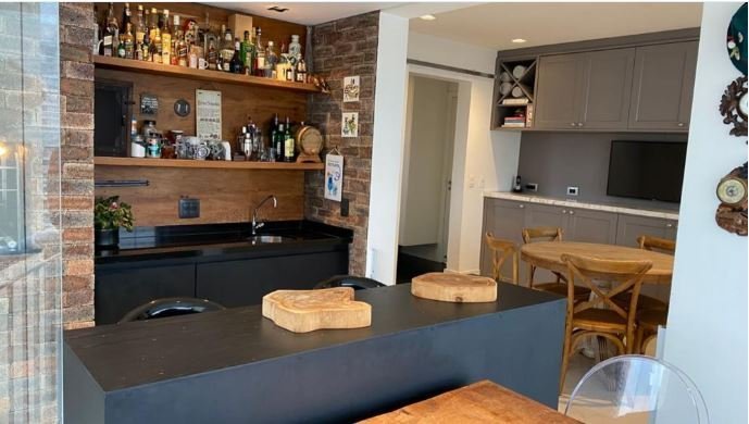 A cozinha, moderna e funcional, está integrada à área de serviço e ao depósito de empregada. A sacada com churrasqueira é um convite para momentos de descontração e lazer.