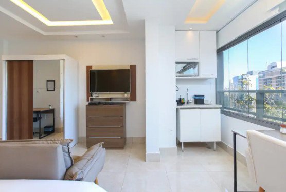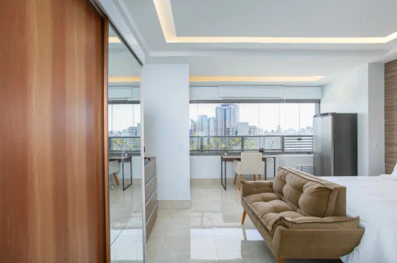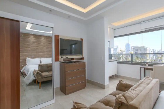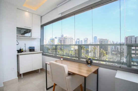 Studio exclusivo no coração do Itaim Bibi, com decoração moderna e elegante, vista deslumbrante da cidade e localizado perto de restaurantes, bares e lojas.